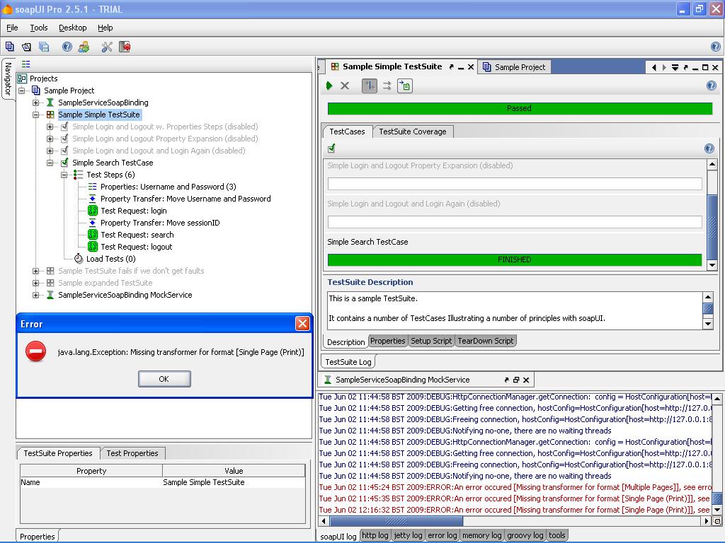 Whilst doing a soapUI Pro demonstration and trying to generate a report, I received the attached exception, "java.lang.Exception: Missing transformer for format [Single Page(Print)]"