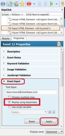 After highlighting the event in the Sidebar, look for the Event Input property in the Properties tab below. You can see the text being entered by the script in the Text Input field. Click the checkbox for "Replay using keystrokes" and click Apply.