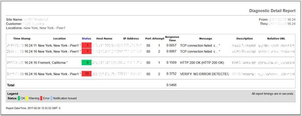 The most popular monitoring type selected by users is Global Verify. The monitoring configuration forces a remote test to verify an error before a notification for the error is triggered. For example; the test below failed from New York at 16:24:11 because the browser was unable to establish a TCP Connection. A retry from New York at 16:24:16 also failed. This triggers a Remote Verification test from a different location, Fremont in this case. The remote test passed with a 200 OK and as a result, we did not trigger a Notification for the error in New York and marked the test with an ST 70.
