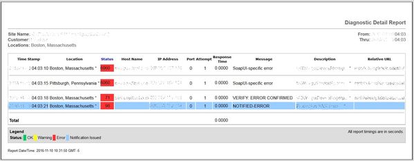 Now look at the example below. In this case we trigger an error from Boston at 4:03:10. There is no retry in this case, we go straight to the Remote Verification from Pittsburgh and that also fails at 4:03:15. Because the error was verified from the remote location, we notify in this case and mark the test as an ST 71.