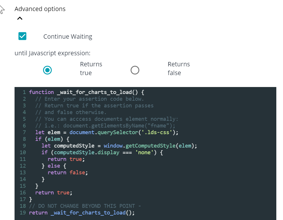 This feature will wait for a target element to either disappear (or appear) before proceeding playback. In a customer's use case, they were targeting an element within a modal with querySelector'#openModal' before clicking "Buy Online". (This was a modal that popped up to generate a coupon). Their validation was attached to the step before they clicked "Buy Online" so the validation would apply before they clicked "Buy Online". The coupon would be applied. (Without this javascript the script would continue before the coupon was generated.)