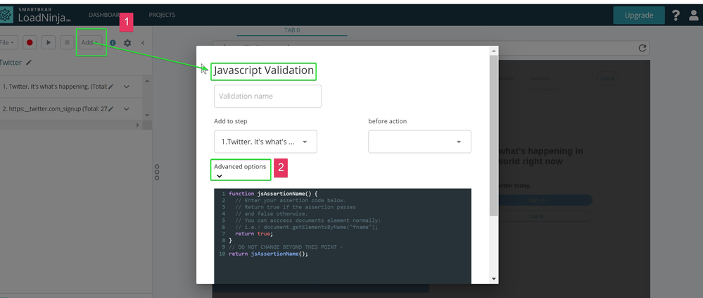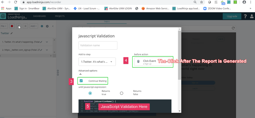 In a use case, the Javascript Validation would be inserted before the point where you want the script to continue. (In the screenshots, there was a report the customer was waiting to be rendered before continuing.)