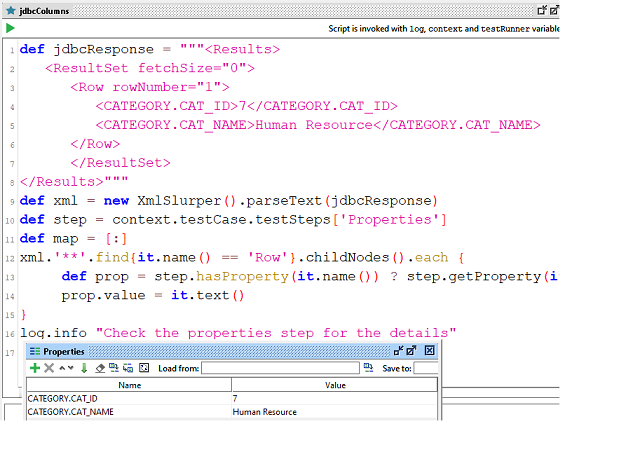 Using some sample Jdbc result and showing how to save the jdbc response into properties