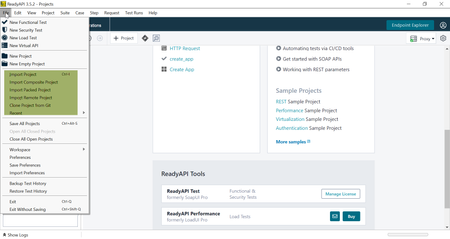 Hello, I am trying to get in a postman collection to ReadyAPI 3.5.2. What am I missing!!!?? 1. I cannot see the "Create Project via Integration "option mentioned in the ReadyAPI documentation ...