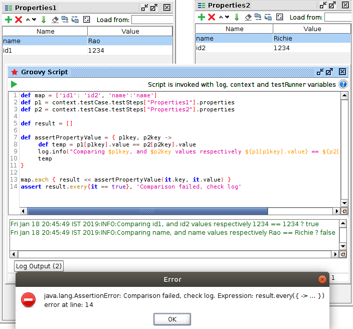 Now I always thought the test executed fine cos tbh i could see the groovy step passed and I could also see the values written to the 2 different properties steps were identical.