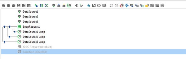 I have a Soap request which is getting data from 3 different data source Excel, JDBC, JDBC. I want to request to get data row 1 from excel, jdbc, jdbc followed by row 2 from excel, jdbc, jdbc. I am looping through each data source but for some reason its not taking same data row from each source.
