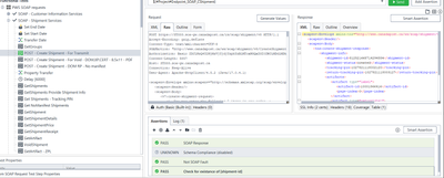 Looks like you're getting a SOAP fault when sending the request. That's likely why you're also getting an assertion failure for the shipment check.