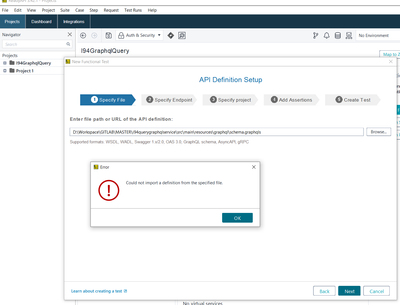 I click on "Create Functional Test" button/screen, it bring up API Definition Setup page. There are 5 steps in the page. I click on Specify File button to specify the API definition. It said "could not import a definition from specified file." .
