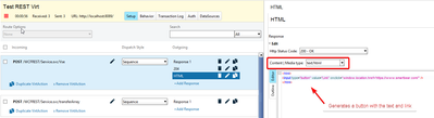 Thank you for your post. To create an HTML page as a response in ServiceV, you need to select the text/html as the Content | Media Type value. The below HTML can be used to create a page with a button and link: