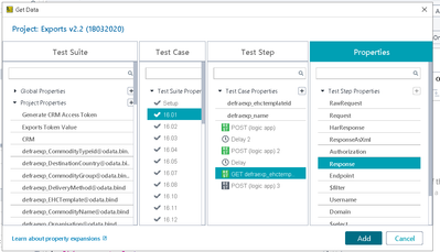 5. In the 'Test Step' column, select the first test step in your test case, this generates the content in the 'Properties' column. Click on the 'Response' value and click 'Add' to launch the next screenshot