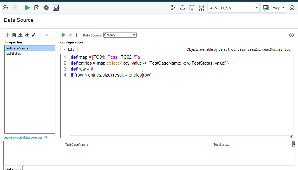 def row = testRunner.testCase.testSteps["Data Source 2xyz"].currentRow; def testDataMap = [TC01:'Pass', TC02:'Fail', TC03:'Fail', TCNN:'Pass']; if ( (row + 1) <= testDataMap.size() ) { result["TestCaseName"] = testDataMap.entrySet()[row].getKey(); result["TestStatus"] = testDataMap.entrySet()[row].getValue(); };Regards,