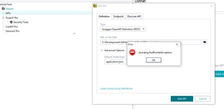 We get an Java.lang.NullPointerException when we try to add an OpenAPI specification into our project in ReadyAPI. Is there any chance to get more information, about the reason for the e...