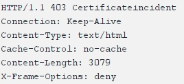 I did notice that youve got a tailored 403. Default 403 returns "forbidden" typically,but your 403 is returning "certificateincident".