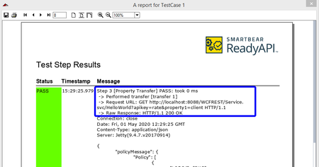 import com.eviware.soapui.impl.wsdl.teststeps.WsdlTestRequestStep import com.eviware.soapui.impl.wsdl.teststeps.RestTestRequestStep import com.eviware.soapui.impl.wsdl.teststeps.HttpTestRequestStep import static com.eviware.soapui.model.testsuite.TestStepResult.TestStepStatus.* import static com.eviware.soapui.impl.wsdl.submit.transports.http.BaseHttpRequestTransport.HTTP_METHOD //Closure to get ExtendedHttpMethod object def eHM = { context.getProperty(HTTP_METHOD) } //Initialize report def message = new StringBuilder() //Add the test properties to report similar to failure case as this helps to understand easily if something is missing or incorrect def addPropertiesToReport = { message.with { append('\n----------------- Properties -----------------\n') append("Endpoint: ${context.endpoint}\n") switch (context.currentStep) { case WsdlTestRequestStep: append("Encoding: ${context.currentStep.testRequest.encoding}\n") break default: append("HTTP Version: ${eHM().protocolVersion}\n") append("Method: ${eHM().method}\n") append("StatusCode: ${testStepResult.getProperty('StatusCode')}\n") append("URL: ${eHM().URL}\n") break } } } def addPayLoadToReport = { subHead, content, additionalData = null -> message.with { append("\n-------------- $subHead --------------\n") if(additionalData) { append(eHM().requestLine).append('\n') additionalData.each { append(it.name + ' : ' + it.value + '\n')} } if (content) { append('\n').append(content).append('\n') } } } //Actual business logic if (([WsdlTestRequestStep, RestTestRequestStep, HttpTestRequestStep].any{context.currentStep in it}) && (testStepResult.status in [UNKNOWN, OK])) { addPropertiesToReport() addPayLoadToReport('Request', eHM().entity?.content?.text, eHM().allHeaders) addPayLoadToReport('Response', context.rawResponse) testStepResult.addMessage(message.toString()) }NOTE: