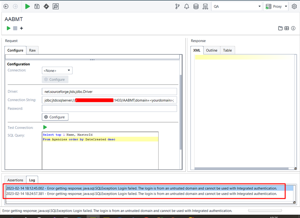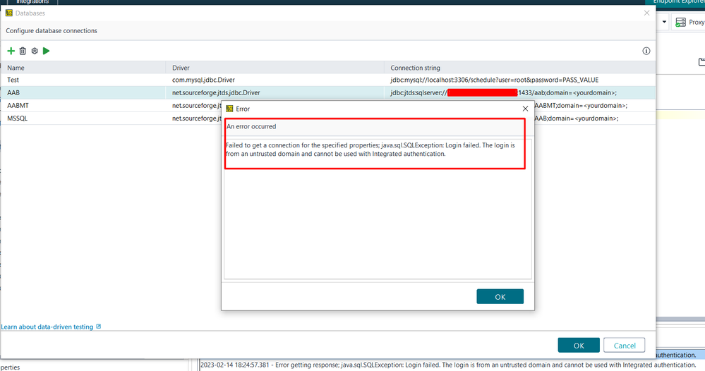 2023-02-14 18:12:45.002 - Error getting response; java.sql.SQLException: Login failed. The login is from an untrusted domain and cannot be used with Integrated authentication.