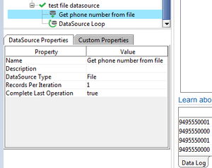 This file datasource uses a text file that has 10 lines in it, each line is a phone number like 9495550000 The data loop as it is doesn't terminate. What could be going wrong? The screen shot s...