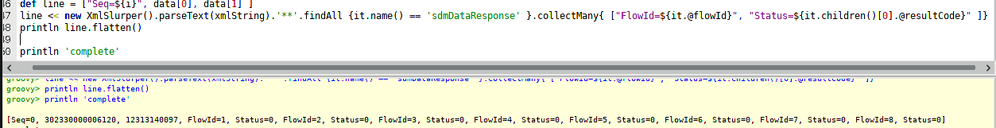 //Assuming you have data array, variable i, and xmlString //Apart from that you can remove everything from the script def line = ["Seq=${i}", data[0], data[1] ] line << new XmlSlurper().parseText(xmlString).'**'.findAll {it.name() == 'sdmDataResponse' }.collectMany{ ["FlowId=${it.@flowId}", "Status=${it.children()[0].@resultCode}" ]} log.info line.flatten()- I thought I saw those brackets from your response.