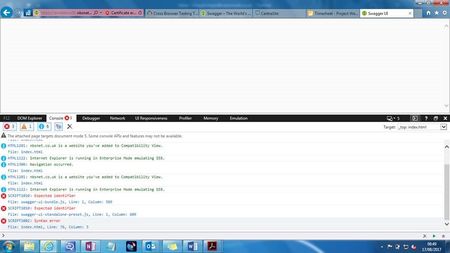 hegdevinuOccasional Visitor8 years agoLocal installation of swaggerUI. Unable to open in IE11 Hello, I have, Client: IE11 is running on 64 bit windows 7 Enterprise. Server: Swagger 3.1.6 as a war file deployed to WebSphere Application Server 8.5.5.9 running Java 8 on Win Server 2012 ...Show More