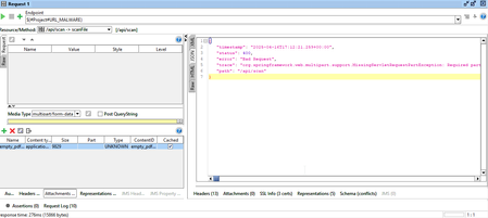 To integrate your `curl -F file=@...` command into SoapUI for binary file uploads, go to the **"Attachments" tab** of your REST Request. Add your file and, most importantly, in the **"Part" column** for that attachment, enter **`file`**. Ensure the "Type" is correct (`application/pdf`) and the request's "Content Type" is `multipart/form-data`. This explicitly names the file part as expected by your API, resolving the "Required part 'file' is not present" error.