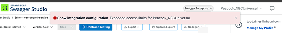 The error says "! Show integration configuration Exceeded access limits for Peacock_NBCUniversal."