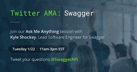 SmartBearJuliaAlumni7 years agoJoin Our Swagger Ask Me Anything! Hi Everyone, We're excited to invite you to our upcoming Swagger Ask Me Anything led by the Lead Software Engineer for Swagger, Kyle Shockey. The AMA will take place on Twitter on Tuesday, Janu...Show More