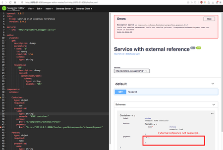 will be properly resolved in the Swagger UI on the right (e.g. in the Schemas section the referenced properties are expandable, etc.). However it seems that the editor doesn't throw an error if an invalid external reference is given (instead the Swagger UI just shows an 'empty' object).