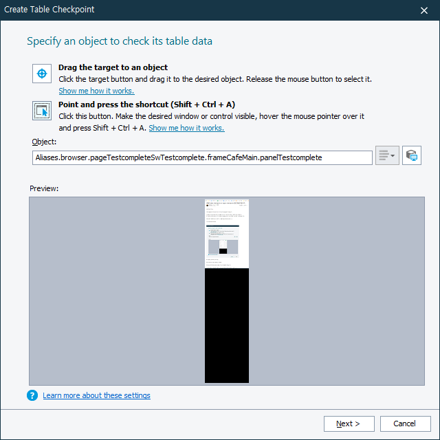 I used Table Checkpoint to try to check table-formatted cell values on the web, but it captures a fairly black screen as shown in the picture.