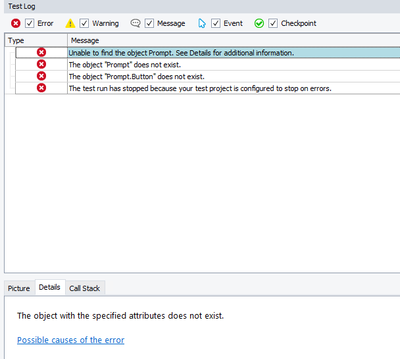 There are always prompt when performing GUI tests, but using following action fails because the object cannot be found.