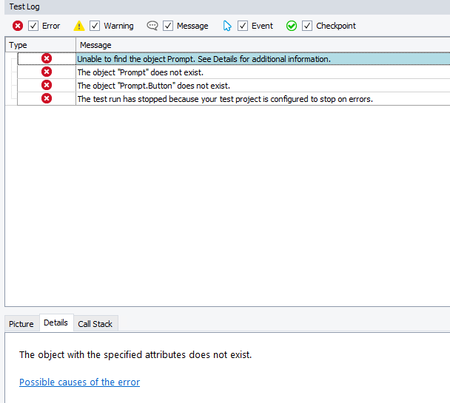 Hello! There are always prompt when performing GUI tests, but using following action fails because the object cannot be found. page = Aliases.browser.Page(*) page.Prompt.Button("OK").Click() Wh...