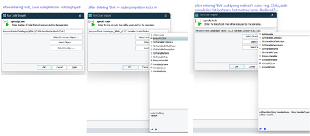 And here is another example of the problem. Apparently, it's not isolated to just keyword tests, but it happens in script modules too. In case of Keyword test, the code completion briefly appears after entering 'dot' behind the LogParams parameter or after using shortcut Ctrl+Space. In keyword test, the code completion window seems appear a bit longer, in case of script module, it only blinks.