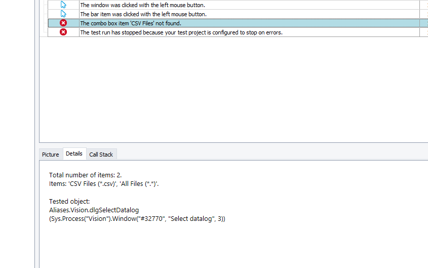In TestComplete keyword test I am facing an issue on opening the csv file from a path in the C folder. This was working very well earlier but now an error comes as below. Could you please help me with this. The csv file remains in the same folder itself and I haven't changed its path.