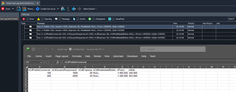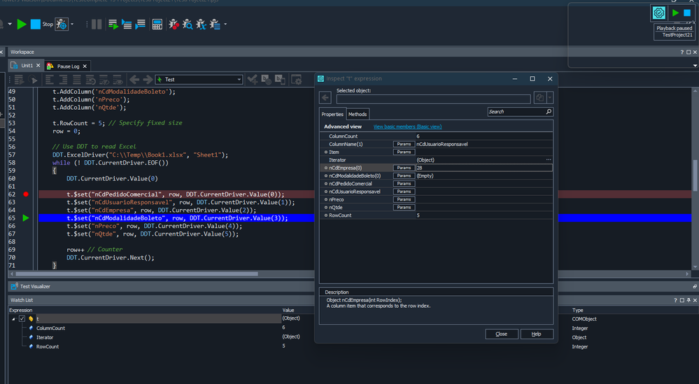 Output resultsfunction Test() { // Create variable, if it doesn't exist if (!Project.Variables.VariableExists("DadosPedidoComercial")) Project.Variables.AddVariable("DadosPedidoComercial", "Table"); // Get a reference to the variable var t = Project.Variables.VariableByName("DadosPedidoComercial"); // Add columns to the table t.AddColumn('nCdPedidoComercial'); t.AddColumn('nCdUsuarioResponsavel'); t.AddColumn('nCdEmpresa'); t.AddColumn('nCdModalidadeBoleto'); t.AddColumn('nPreco'); t.AddColumn('nQtde'); t.RowCount = 5; // Specify fixed size row = 0; // Use DDT to read Excel DDT.ExcelDriver("C:\\Temp\\Book1.xlsx", "Sheet1"); while (! DDT.CurrentDriver.EOF()) { DDT.CurrentDriver.Value(0) t.$set("nCdPedidoComercial", row, DDT.CurrentDriver.Value(0)); t.$set("nCdUsuarioResponsavel", row, DDT.CurrentDriver.Value(1)); t.$set("nCdEmpresa", row, DDT.CurrentDriver.Value(2)); t.$set("nCdModalidadeBoleto", row, DDT.CurrentDriver.Value(3)); t.$set("nPreco", row, DDT.CurrentDriver.Value(4)); t.$set("nQtde", row, DDT.CurrentDriver.Value(5)); row++ // Counter DDT.CurrentDriver.Next(); } DDT.CloseDriver(DDT.CurrentDriver.Name); // Output each row t.RowCount = row; // Update row count for (var i = 0; i < t.RowCount; i++) { var logMessage = "Row " + i + ": " + "Pedido=" + t.$get("nCdPedidoComercial", i) + ", " + "Usuario=" + t.$get("nCdUsuarioResponsavel", i) + ", " + "Empresa=" + t.$get("nCdEmpresa", i) + ", " + "Modalidade=" + t.$get("nCdModalidadeBoleto", i) + ", " + "Preco=" + t.$get("nPreco", i) + ", " + "Qtde=" + t.$get("nQtde", i); Log.Message(logMessage); } // Output each row and column for (var i = 0; i < t.RowCount; i++) { var rowText = "Row " + i + ": "; for (var c = 0; c < t.ColumnCount; c++) { var colName = t.ColumnName(c); rowText += colName + "=" + t.$get(colName, i) + "; "; } Log.Message(rowText); } }Also, is there any particular reasons for using a Table variable?