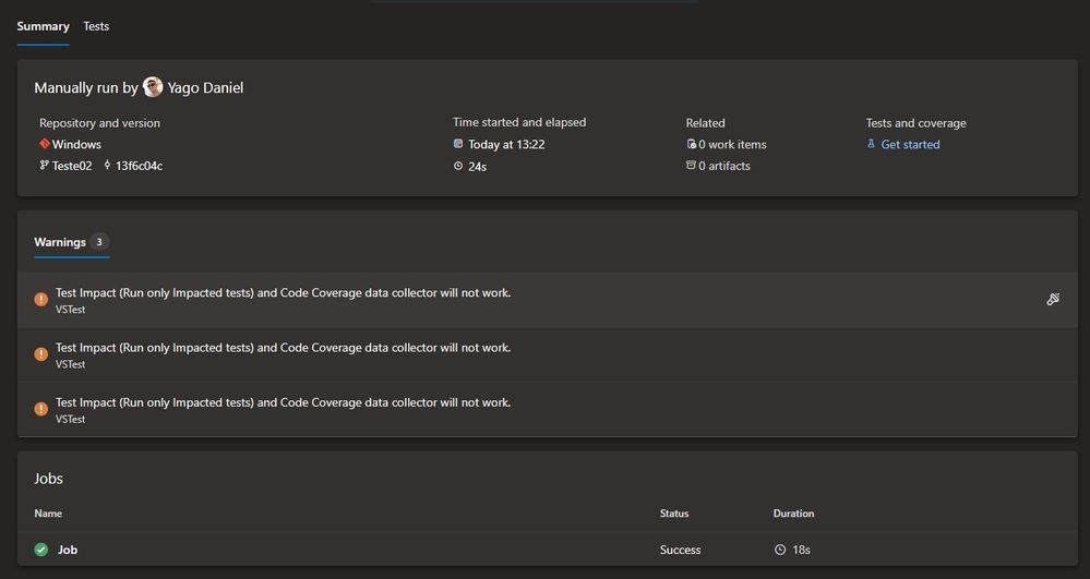- task: VSTest@3 inputs: testSelector: 'testAssemblies' testAssemblyVer2: 'C:\agent\_work\1\s\TestComplete\BusinessAutomacao\BusinessAutomacao.pjs' searchFolder: 'C:\agent\_work\1\s\TestComplete\BusinessAutomacao\' testFiltercriteria: 'Project=BusinessCSAutomacao' vsTestVersion: 'toolsInstaller'Now with this code, the Pipeline did not give an error, but it also did not run any tests