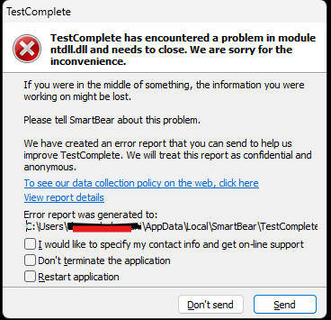 7 months agocharanbalagouni So to clarity, you are saying that the crash happens consistently while TestComplete starts up? From my experience, some anti-virus software may cause TestComplete to crash. Especially if the crash happens on startup. Try disabling it and see if that helps. If not, please file a support ticket at https://support.smartbear.com/testcomplete/message/