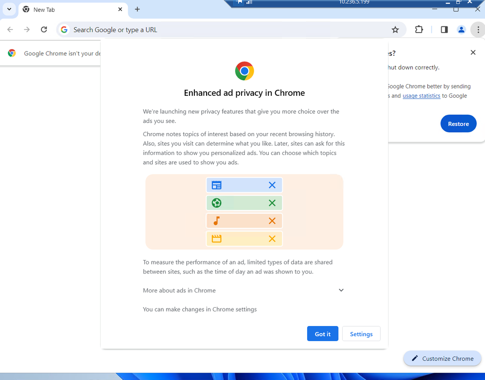 I am trying to run y ATP on chrome browser and it runs fine on my local system. Whereas when I try to run the ATP on my scale set VM, I get a window in the chrome browser as shown in the snap below. My ATP is not able to move past this window and fails here itself. How to close or handle this window "Enhanced ad privacy in Chrome"