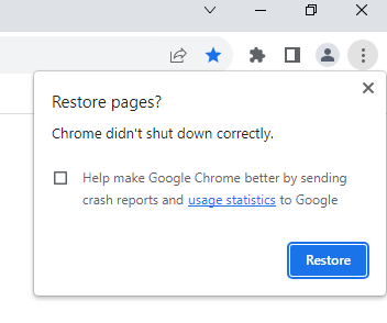 The restore popup is, to me, ignored by TestComplete when I run my scripts when it appears and will eventually go away.