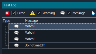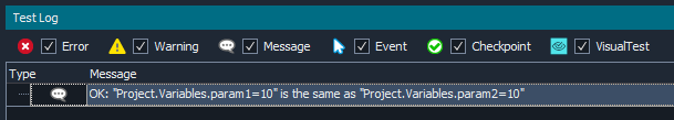 function CompareVars(var1, var2) { // equal value and equal type if (var1 === var2) { Log.Message("Match!"); return true; } else { Log.Message("Do not match!"); return false; } } function main() { CompareVars(Project.Variables.param1, Project.Variables.param2); CompareVars(Project.Variables.VariableByName("param1"), Project.Variables.VariableByName("param2")); var str1 = "Hello" var str2 = "Hello" CompareVars(str1, str2); var int1 = 10 var int2 = 11 CompareVars(int1, int2); }The function just compares two variables (and the type), and that's it. You just pass in the appropriate two parameters, and results will be shown as