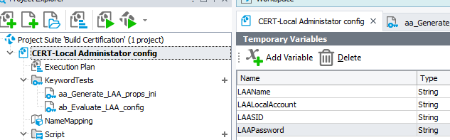 I have 4 values I will be using across a suite of tests I am defining. I have created persistent project variables to store these values (LAA = Local Admin account)