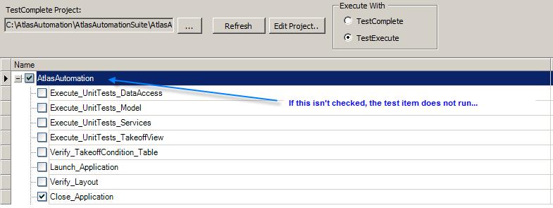 This is made worse by the fact that after I refresh each one I have to individually uncheck all Test Items except the one I want to run.  I cannot uncheck the main project in the tree (which unchecks all child test items).  If I uncheck the main project, the test does not run.  (See the attached screenshot for an image of what I mean...)