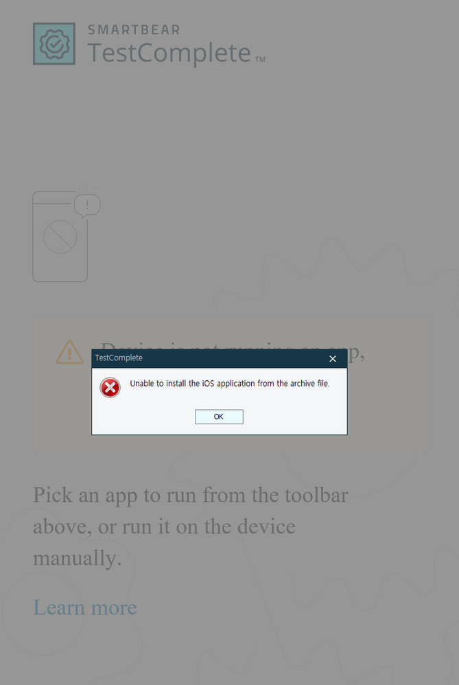 When running after selecting the Show Mobile Screen > app, the error pop-up is exposed and cannot proceed.