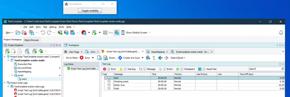Are you able to zip your TestComplete Exists Wait Demo project and attach it to this post please? I'll try it on my end.