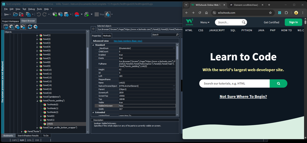 Providing the object appears in the Object Browser, and the action you want to perform - if performing a Click action, TestComplete will automatically scroll down the web page (start from top of page),