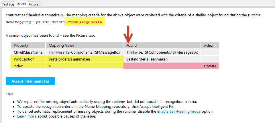 When I accept the Intelligent Fix (what I usually don't do), the next time I run the testcase then can happen 2 things: