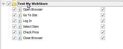You can organize test items into a plain list, grouped list or a tree-like structure (where child items are run after the parent item has finished running). You can exclude test items from or include them in the test run using the check box next to the test item name.