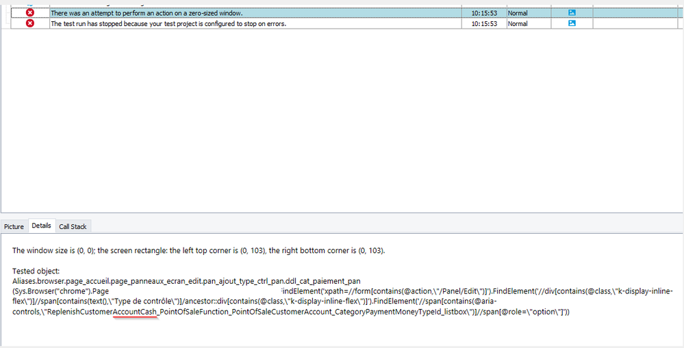 When I run my keyword test and it's the second selector that I need, it fails and in the "Details" tab on the report log" you can see that TestComplete has only looked in the first selector.