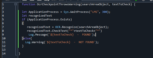 Log.Message("Grid object exists. Performing OCR...");let recognizedText = OCR.Recognize(searchAreaObject);