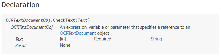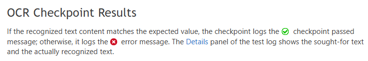 Use the CheckText method to perform an OCR Checkpoint, that is, to verify that the text, which a UI element or an image contains and which TestComplete recognizes, matches a specified string. If the verification succeeds, the method will post a success message to the test log; otherwise, it will post a failure message.