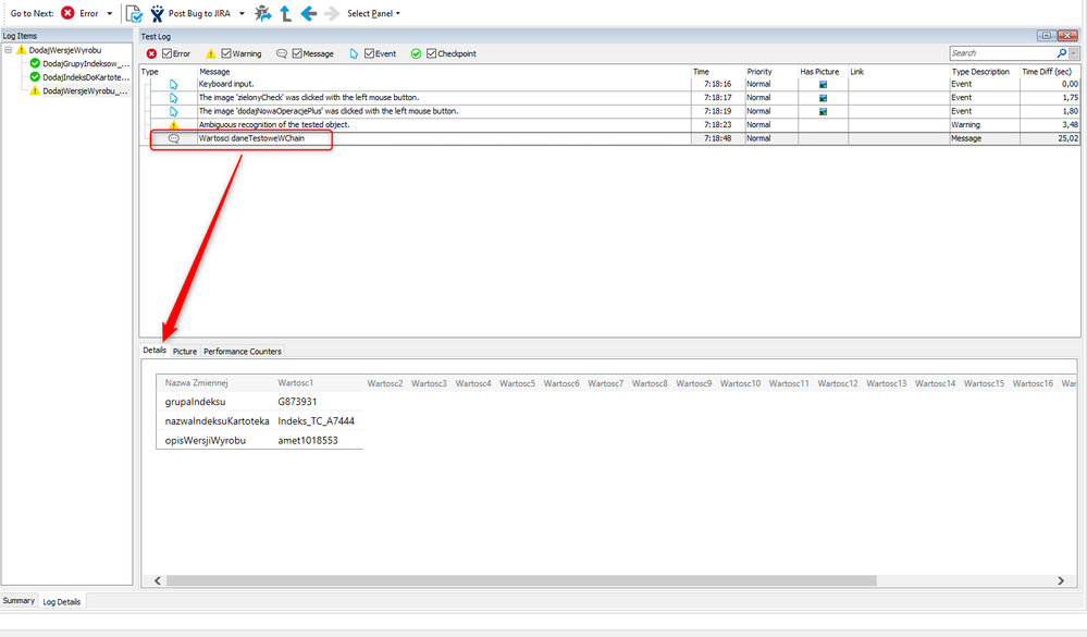 var attr = Log.CreateNewAttributes(); attr.ExtendedMessageAsPlainText = false; Log.Message("Check table Values", html, 300, attr);Check values in log and see the table in the "deails" tab.