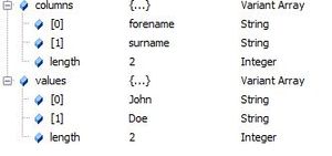 recordset.AddNew(); recordset("forename") = "John"; recordset("surname") = "Doe"; recordset.Update;- Convert a JScript array to safeArray in the following way: