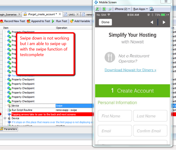 I am working on iOS application , i do use on screen function wPropertyY to set the screen on y axis, but on another screen this function is not available, so i used the Swipe (start x, start y, end x, end y ) function. This is the Function that is not doing anything but it is passing on the Testlog. to see the values please see this function. by the logic it should scroll down the screen.